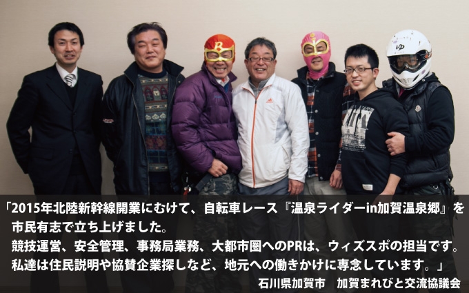 『温泉ライダーin加賀温泉郷2012片山津温泉』は、発案から255日という短期間に、110回もの会合を重ねて開催を実現しました。地元を何とか盛り立てたい!という自転車好きのメンバーが知恵を絞って汗をかいて、振り返らずにダァーッと進んでいきました。